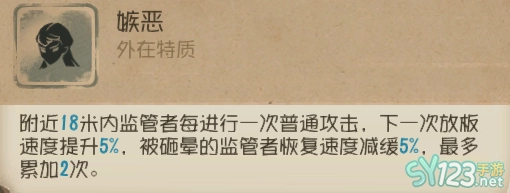 外在特质-嫉恶:附近18米,监管者每进行一次普通攻击,下一次放板速度提升10%,监管者被砸晕后恢复时间减慢10%,至多叠加2层。