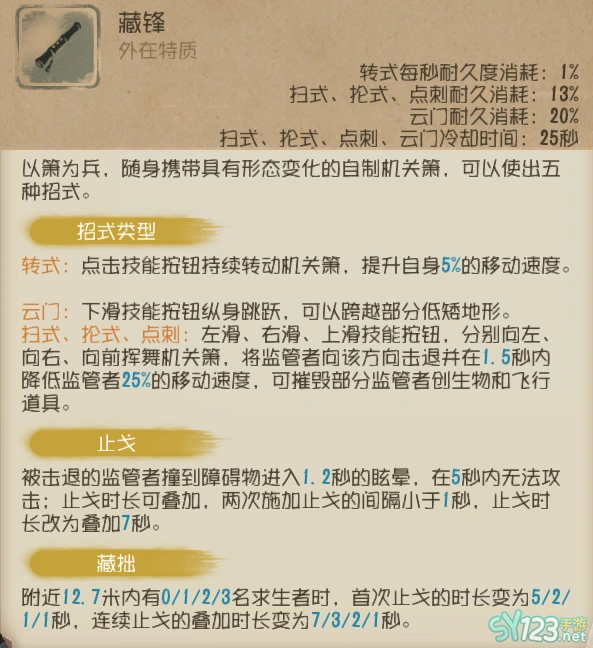 总结分析:只从技能面板上看,古董商这个求生者很强,技能也很全面,负面特质可忽略不计,只是被治疗时间变慢20%。定位是牵制/救人,技能的上限很高,开门战的时候,用长萧把监管者击晕,之后6~9秒时间,监管者只能眼睁睁看着求生者跑路。 救人的时候,利用椅子把监管者击晕,可以无伤救人,安全掩护队友离开。