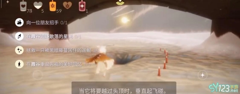 3、等待光芒从这里飞过的时候,飞起来触碰到光芒就是追逐到散落星光了,触碰到会有提示的。