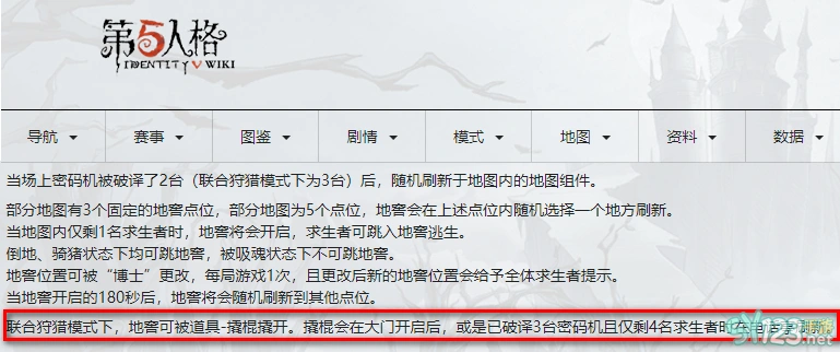 联合狩猎模式下,地窖可被道具-撬棍撬开。撬棍会在大门开启后,或是已破译3台密码机且仅剩4名求生者时在电话亭刷新。