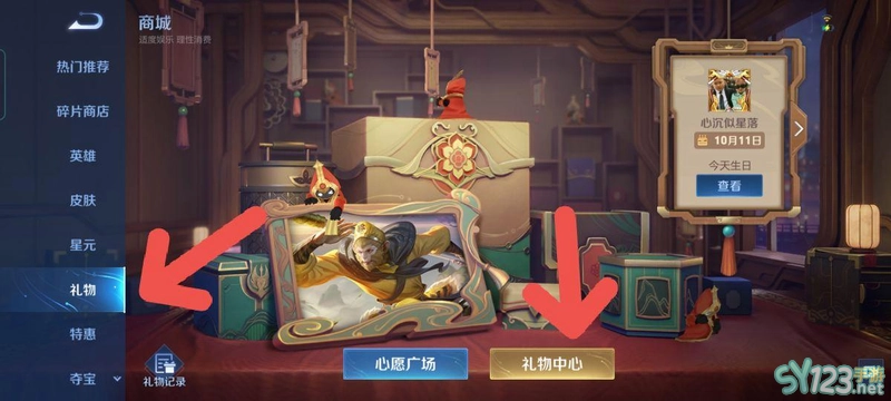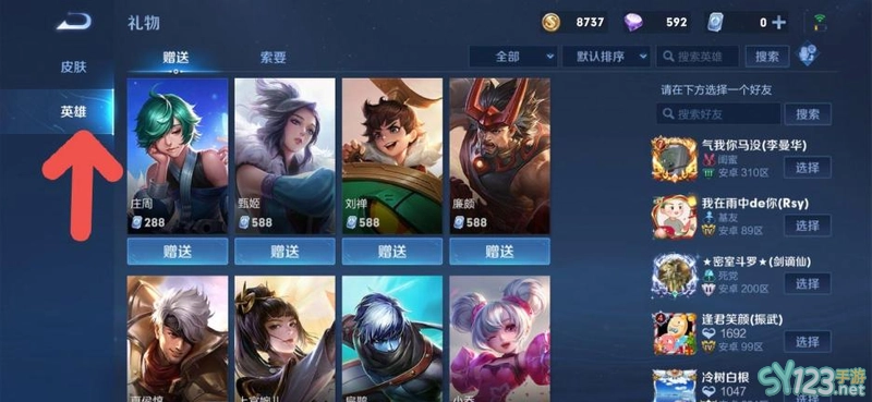 3.在礼物中心里点击左侧的英雄,这样就可以选择自己想要送的英雄给好友了。